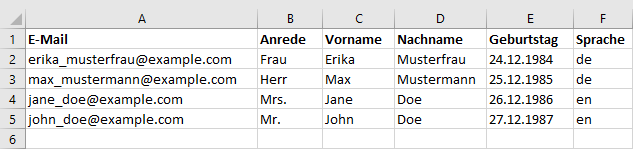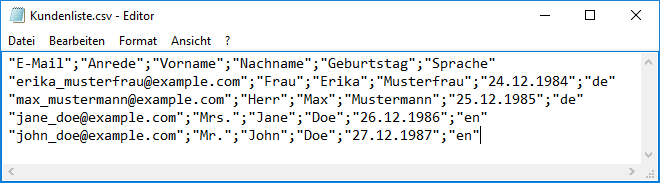 Abonnenten: ImportWahrscheinlich haben Sie bereits eine Liste von Adressen zusammengestellt, die Sie per Newsletter anschreiben möchten. Über das universelle CSV-Dateiformat lassen sich Ihre Adressen aus nahezu jeder Datenbank oder Tabellenkalkulation (z. B. Microsoft Office oder Open Office) exportieren und anschließend in asnm e2M importieren. Um die Zuordnung der Spalten (z. B. Vorname, Nachname, E-Mail) beim Import zu erleichtern, sollte die erste Zeile Ihrer CSV-Datei aussagekräftige Spaltenüberschriftten enthalten. Ein Beispiel: