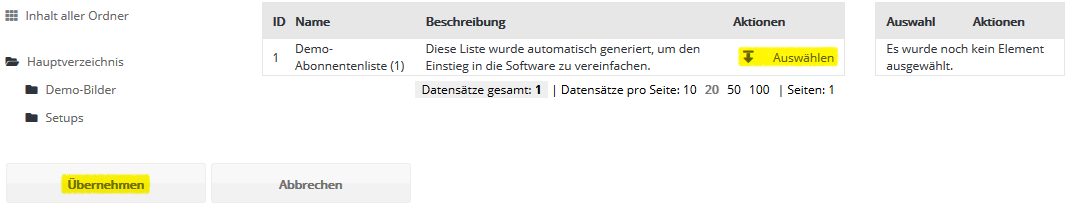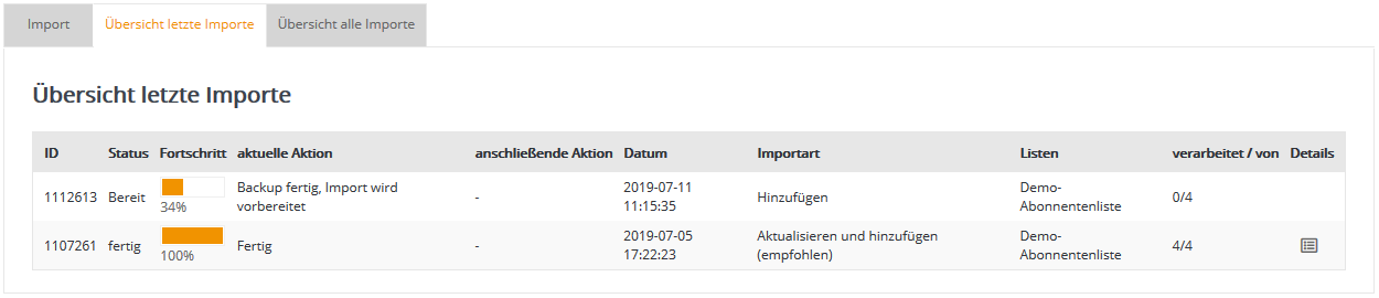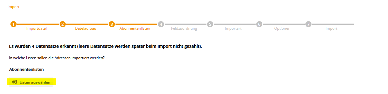 Schritt 3 - AbonnentenlistenWählen Sie nun aus, in welche asnm e2M Abonnentenliste ihre CSV-Datei importiert werden soll. Falls Sie zuvor keine eigene Abonnentenliste in asnm e2M angelegt haben (siehe Menü Abonnentenlisten), steht zum schnellen Einstieg die leere Abonnentenliste 'Demo-Liste' bereit. Diese Liste wird in der Regel bei der Einrichtung Ihres asnm e2M Kontos angelegt und zur Demonstration mit einem Beispiel-Abonnenten befüllt.