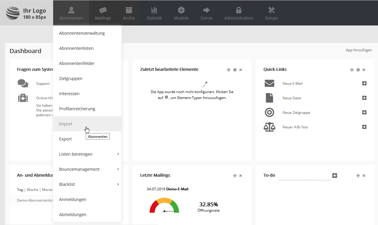 Zum Abspeichern Ihrer Daten wählen Sie bitte je nach Version Ihres Office-Paketes das Exportformat CSV UTF8 (Trennzeichen-getrennt) oder CSV (Trennzeichen-getrennt). Import Schritt für Schritt erklärtUm Ihre CSV-Datei in asnm e2M zu importieren, wählen Sie im Menü 'Abonnenten' den Punkt 'Import':