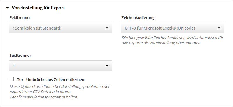 Folgende 'HTML-Editoren' sind in asnm e2M integriert und nutzbar: Grundeinstellung ExportHier legen Sie die Voreinstellung für den Export von CSV-Dateien fest, z. B. für den Export von Abonnentendaten. Bei der Durchführung jedes Exportes können Sie bei Bedarf auch eine abweichende Einstellung wählen. Standardeinstellung ist die Option 'UTF-8 für Microsoft Excel® (Unicode)', technisch gesprochen 'UTF-8 mit BOM'. Dieses Format wird von den meisten Officeanwendungen automatisch erkannt, so dass Umlaute und Sonderzeichen ohne manuelle Formatwahl korrekt importiert werden. StatistikeinstellungenTragen Sie Ihre eigenen Maximalwerte ein, um die rot|gelb|grün Farb-Umschaltung der Statistik-Anzeige für Öffungsrate, Klickrate und Bouncerate an die typischen Werte Ihrer Mailings anzupassen. Nur Ihre besten Mailings sollten den grünen Bereich erreichen. Die Farb-Umschaltung erfolgt automatisch in Drittel-Stufen des eingetragenen Maximalwertes. Empfehlung: Notieren Sie aus der Statistik Ihrer bisherigen Mailings die Durchschnittswerte für Öffnungsrate, Klickrate und Bounces. Damit dieser Durchschnittswert zukünftig im mittleren Drittel der Skala landet, tragen Sie das Doppelte dieses Wertes als Maximum in das jeweilige Feld ein. Tragen Sie z. B. 30% als Maximum ein, dann werden anschließend die Werte bis 10% rot, bis 20% gelb und darüberliegende Werte grün gefärbt. Sie sehen sofort, ob Ihr aktuelles Mailing über- oder unterdurchschnittlich abschneidet. Typische Durchschnittswerte: