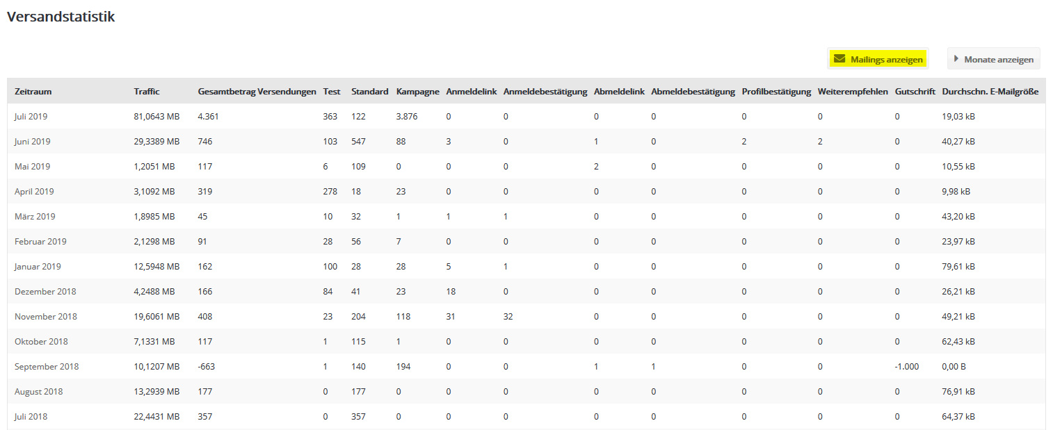 Die 'Versandstatistik' zeigt die Menge des entstandenen Traffics und die Anzahl der Zustellungen Ihres Accounts an, wahlweise pro Zeitraum ('Monate anzeigen') oder pro Mailing ('Mailings anzeigen'):