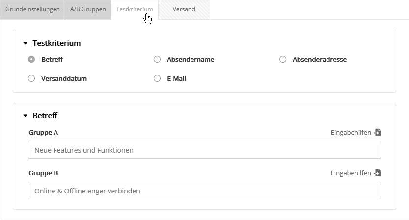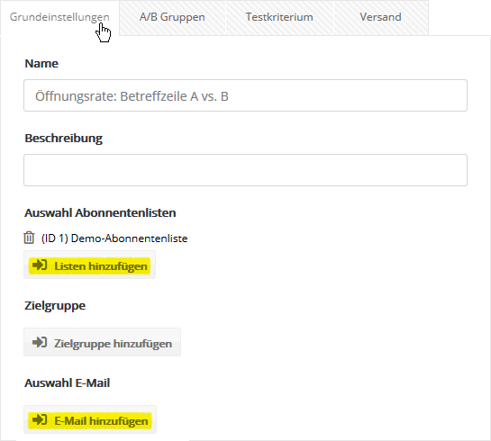 --> Hinweis: Im A/B-Test versenden Sie an Ihre realen Abonnenten. Achten Sie darauf, dass im gewählten Mailing alle zum Versand benötigten Einstellungen (wie z. B. der Absendername) vollständig hinterlegt sind.
