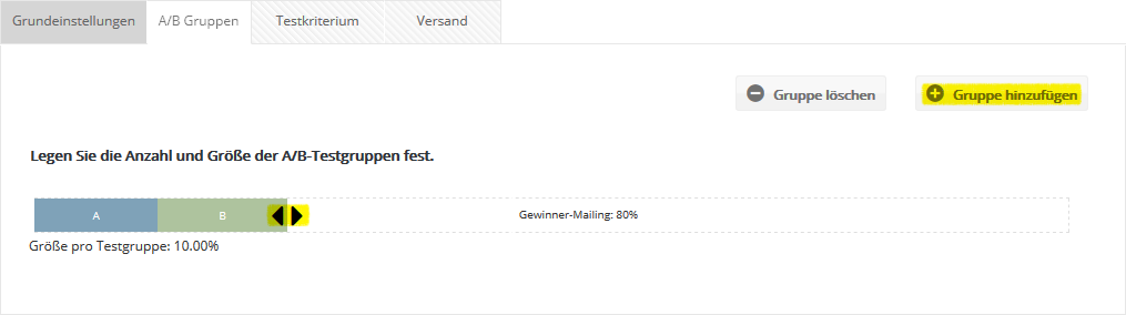 Stellen Sie per Schieberegler die Größe der gewünschten Testgruppen ein, d.h. wieviel Prozent Ihrer Abonnenten sollen am A/B-Test teilnehmen. Möchten Sie mehr als 2 Varianten Ihres Mailings vergleichen, fügen Sie über den Link 'Gruppe hinzufügen' weitere Testgruppen hinzu. Es lassen sich maximal 7 Testgruppen anlegen, etwa um auf der Suche nach dem besten Versandzeitpunkt die 7 Tage der Woche gegeneinander antreten tu lassen.