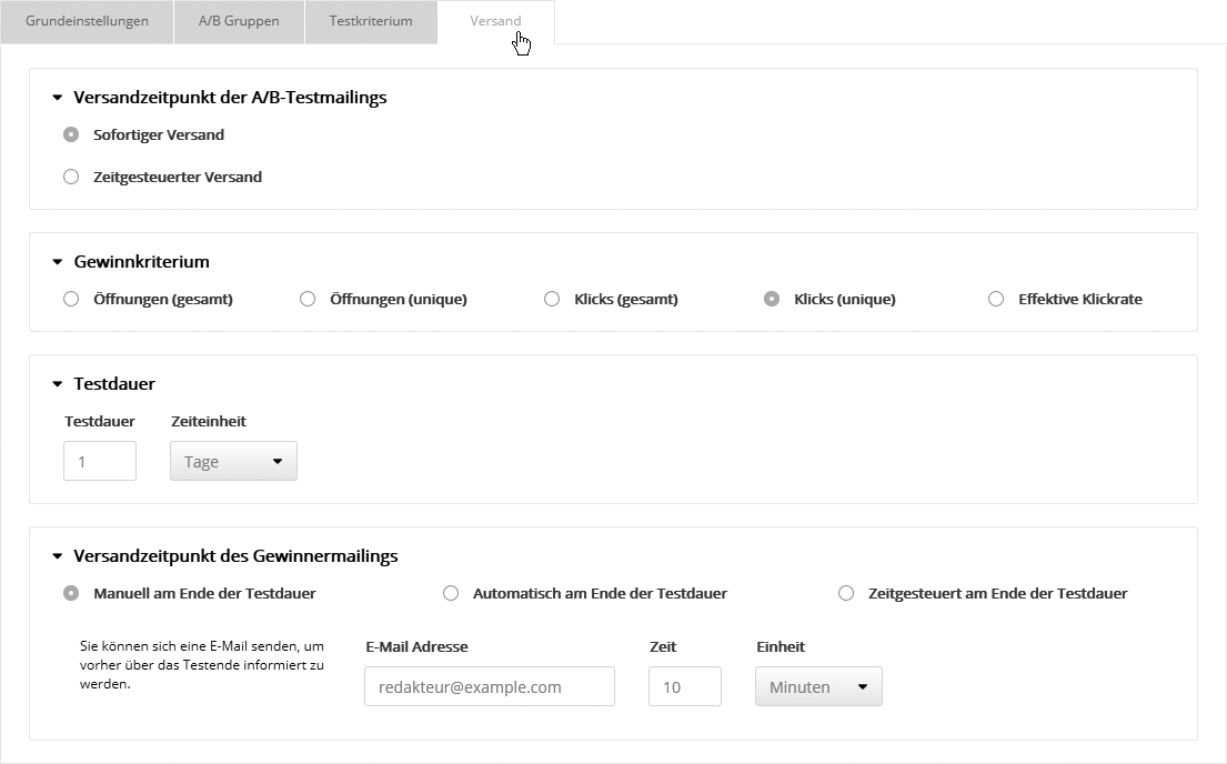 - Zeitgesteuert am Ende der Testdauer: Das Gewinnermailing wird automatisch zum von Ihnen gewählten Zeitpunkt nach Ablauf der Testdauer verschickt.
