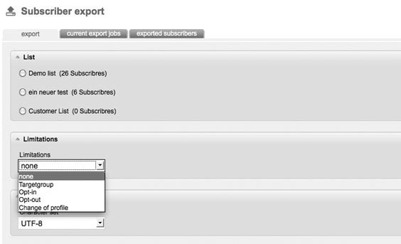 Subscribers lists can be exported from asnm e2M as CSV – files. An advantage, for example, is that you can back up the address lists in this way. In the tab 'Export’, you can make choices of the lists that have to be exported. Per export only one subscriber list can be chosen. If you only want to export certain data records, you can decide on 'Limitations’. |