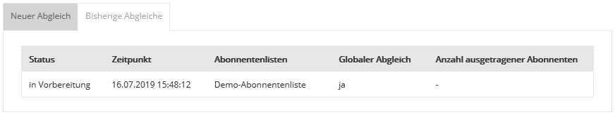 Daraufhin startet asnm e2M den Abgleich. Im Reiter 'bisherige Abgleiche' können Sie den Status des Fortschrittes einsehen. Nach Fertigstellung wird Ihnen die Anzahl der ausgetragenen Abonnenten angezeigt. |