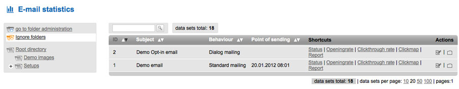 Here you find the statistics of all sent mails. For easier access asnm e2M already includes a demo-mail you can view. |