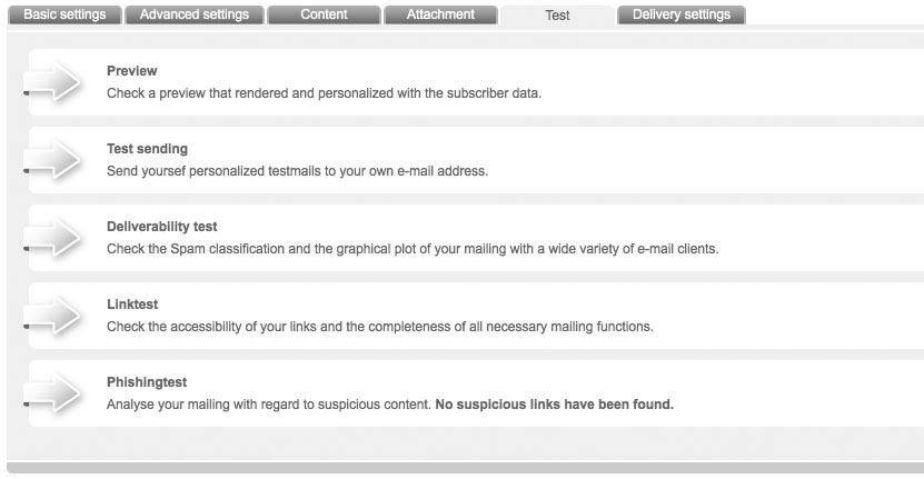 Having finished your newsletter, asnm e2M offers you numerous testing possibilities. This helps you to optimize your mailing and achieve maximum success before actual dispatch. You can get to the testing functions by choosing the tab 'Test' in the menu in which you edit your mailing. Following tests are available: |