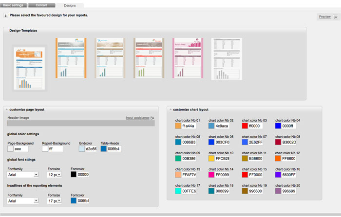 Now you also can adjust the design of your report. Choose the tab 'designs'. By default asnm e2M suggests you six different layouts. HTML experts can also open the 'advanced settings' below the layouts to edit the html-code. For example you can insert your logo in th header.