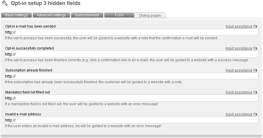 Now enter a name and an optional description for your optin setup. Then choose the 'mode' (important). The following modes are supported by 'asnm e2M': Double Opt-in with confirmation e-mail (recommended as the only legally secure login variant): Interested party visits a website with an optin setup form. He enters his data into the form. He gots an e-mail with content like this: „Thank you for your optin. Please confirm the registration confirmation link to complete your registration.“ He clicks the link. Registration is completed. He gots a „welcoming“ e-mail. You can integrate information about your company and a certain design as well. Double Opt-in: Like described before, but without sending of a „welcoming“ e-mail. Confirmed Opt-In: Nach Anmeldung auf der Webseite wird sofort eine automatische Begrüßungsnachricht versendet. Single Opt-in: No e-mails will be send. There just will be a message in your browser, that registration was successfull. According to the mode you've choosed, you have to adapt different sub-options. In Tab 'advanced settings' you can deposit your e-mail address in field 'e-mail forwarding', to be informed about new subscribers. In field 'mailing for later delivery' you can determine your last sended newsletter. All new subscribers will receive your last mailing and don't have to wait for another one. To protect your optin-form against abuse, activate the invisible captcha . Captchas are often used to check if petitions are produced by a machine (robot, short: bot) or a real person. Bots are often used abusive to generate masses of subscriptions. Choose your favorite subscriberfields, which should be filled in in next tab 'Form'. After clicking 'Add subscriberfield' a pop up appears, where you can select and add subscriberfields to your optin-form. Furthermore you can add one or more subscriberlists as option(s) in a ceckbox through the button 'add subscriberlist'. Click 'sort formfields' to edit order of your fields. Click 'test form' to check your form by a preview of your optin-form. Next tab: 'Dialog pages':