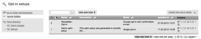 Through 'Setups' and 'Optin Setup' you can create forms, which can be included into your website. So interested parties can login automatically on your website for your subscriberlist(s). Please note: Requirement for a successfull 'optin setup' is to create an e-mail with type 'dialog mailing' for registration confirmation and welcoming, which got the status 'activated'. Otherwise those mailings will be lacking in the shortlist of mailings which you can choose for your optin setup. For an esier start asnm e2M gots a „Demo optin setup“ for you. Created optin setups can be 'opend' afterwards for editing, 'moving' to another folder or 'deleting'. If you have moved an optin setup into another folder, click 'open folder' to get into. Create new Optin setup |