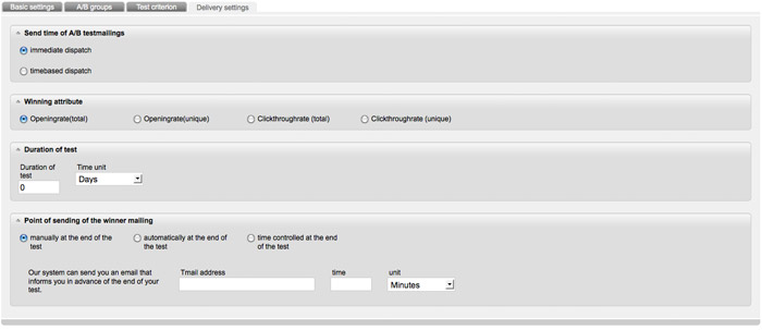 In the last tab you define the settings for the dispatch. Determine by which criterion (opening-rate or click-through-rate) asnm e2M should identify the winner. Equally important is to determine the duration of the test.