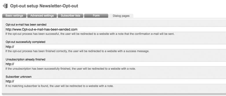 Enter a name and an optional description. Choose the 'mode' (important). The following modes are supported by 'asnm e2M': Double-optout with confirmation e-mail: after unsubscribe from your website or your newsletter a confirmation email will be send automatically. Optout will be activated after clicking the confirmation link in this email. After successful unsubscription the former subscriber will get a last email („You unsubscribed successfully of our newsletter.“) Double Optout: Like described before, but without sending of a „successful unsubscription“ e-mail Confirmed Opt-Out (recommended): After unsubsubscription on your website or in your newsletter a „successful unsubscription“ email will be sended immediately. Single Optout: No e-mails will be send. There just will be a message in your browser, that optout was successfull. In Tab 'advanced settings' you can deposit your e-mail address in field 'e-mail forwarding', to be informed about unsubscriptions. Tab 'subscriberlists': Choose your favorite subscriberlist(s), where all unsubscriptions should be logged out. Select the subscriberfields, which should be filled out by your subscribers in tab 'Form'. After clicking 'create form fields' a popup appears, where you can choose and add subscriber fields to your form. Click 'sort formular fields' to arrange your fields. Click 'test form' to open a new tab in your browser with a preview of your form. Source Code of your website is genereated by 'asnm e2M' by clicking 'Formular soruce code'. A popup appears with your source code. Last tab: Dialog pages |