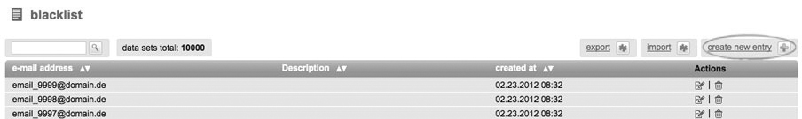 | You create a blacklist (also called Robinson list) in order to restrict email addresses from registering in you subscriber list. If a person tries to sign up for one of your subscriber lists, but has an email address that is registered in your blacklist, he will not notice the exclusion. Those addresses, however, which are already signed up for a subscriber list, will be excluded from dispatch directly after having been registered in the blacklist. Therefore, these subscribers will not receive any of your mailings anymore. |