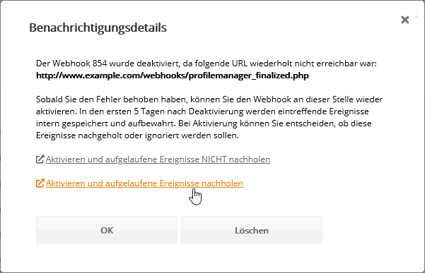 Erfolg oder Fehler: Element im Mandantensystem verteilenWird im Mandantensystem ein Element (Template, Mailing usw.) in andere Accounts verteilt, erhält jeder beteiligte Account eine Benachrichtigung. Das gilt ebenso für die accountübergreifende Änderung des Aktivierungsstatus eines Elementes. Die häufigste Fehlerursache ist ein nicht eingetragener Stellvertreter am Element eines Zielaccounts, etwa der Stellvertreter eines Templates beim Verteilen einer E-Mail. Die Stellvertreter sind notwendig, damit das verteilte Element alle benötigten Bestandteile unabhängig von (eventuell abweichenden) IDs in jedem Ziel-Account zuordnen kann. Die Nachricht im Quellaccount teilt mit, zu welchem Zeitpunkt in wieviele Zielaccounts die Verteilung erfolgreich oder fehlerhaft war. Fehler: WebHook fehlgeschlagenSchlägt der Aufruf eines WebHooks wiederholt fehl, weil die hinterlegte URL nicht erreichbar ist, wird dieser WebHook vom System automatisch deaktiviert. Parallel wird eine Systembenachrichtigung erzeugt. Möchten Sie einen WebHook wieder aktivieren, öffnen Sie die Nachricht und klicken Sie den gewünschten Aktivierungs-Link an. Dabei können Sie entscheiden, ob die in den ersten 5 Tagen nach Deaktivierung aufgelaufenen Ereignisse nachgeholt werden sollen..