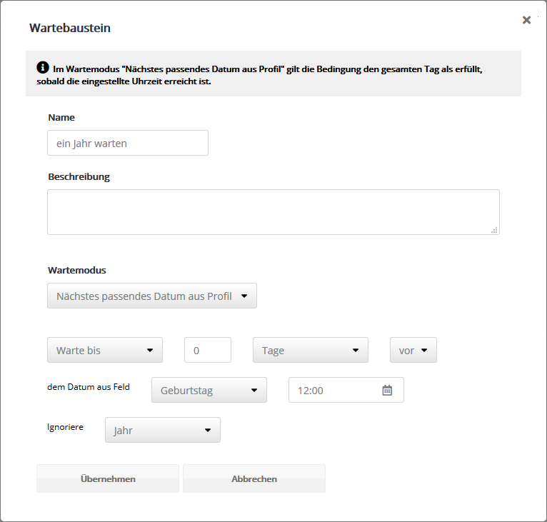 - Nächstes passendes Datum aus Profil: Das typische "warten bis Geburtstag". Hier bestimmt der Wert im Datumsfeld jedes Abonnenten ganz individuell, wie lange gewartet wird. Die Bedingung gilt den gesamten Tag als erfüllt, beginnend ab der im Baustein eingestellten Uhrzeit. Optional lässt sich zum Datum des Abonnenten noch eine Verschiebung addieren oder subtrahieren. Damit verschicken Sie beispielsweise Informationen zur Anreise schon 5 Tage vor dem vom Abonnenten gewählten Anreisedatum.