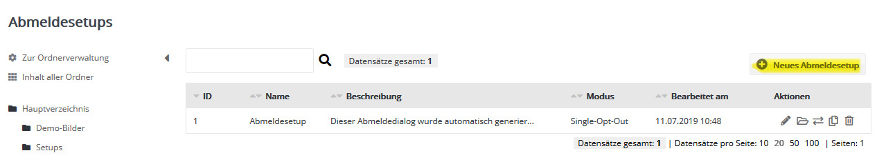 Ablauf einer AbmeldungKlickt der Empfänger den Abmeldelink an, wird ein in asnm e2M eingerichtetes 'Abmeldesetup' angestoßen und der Abonnent vom Newsletter-Empfang abgemeldet. Das kann je nach Einstellung entweder sofort oder nach nochmaliger Bestätigung (Double-Opt-Out, nicht empfehlenswert) passieren. In den Eigenschaften eines Abmeldesetups wählen Sie die Bestätigungsnachricht aus und optional die Abonnentenlisten, aus denen der Abonnent entfernt werden soll. Ist der Abonnent aufgrund der Abmeldung in keiner einzigen Abonnentenliste mehr enthalten, wird er auch aus der 'Abonnentenverwaltung' entfernt. Neues Abmeldesetup erstellen |