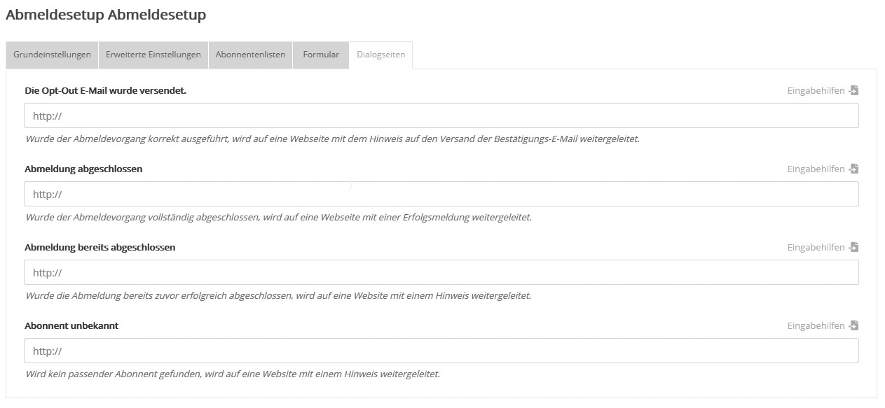 AbonnentenlistenJe nachdem, ob die Abmeldung per Newsletter-Link oder per Website-Formular stattfindet, wird der Abonnent aus folgenden Listen abgemeldet: Variante 1: Abmeldelink im NewsletterFür Standardmails gilt: Zusätzlich zu den auf dem Reiter 'Abonnentenlisten' gewählten Listen findet die Abmeldung auch in den angeschriebenen Listen statt. Für Kampagnen- und Dialogmails gilt dieser Zusatz nicht, da diese nicht an eine bestimmte Liste verschickt werden. Variante 2: Abmeldeformular auf WebsiteDie Abmeldung findet in den unter 'Abonnentenlisten' markierten Listen statt, und wenn vorhanden, dann auch in den direkt im Formular zur Auswahl durch den Nutzer angebotenen Listen (siehe nächster Abschnitt 'Formular'). Beides gleichzeitig ist nicht möglich. Das heißt: Sobald Sie eine Liste im Reiter 'Abonnentenlisten' markiert haben (und damit fest vorgeben), kann sie nicht gleichzeitig im Abmelde-Formular (ab)wählbar sein. Im dem Fall wird sie automatisch aus dem Formular entfernt und umgekehrt. Sonderfall beim Abmeldeformular: Ist keine Liste zur Abmeldung markiert und auch im Formular keine enthalten, dann findet die Abmeldung in allen Listen statt. Damit wird der Abonnent auch aus der 'Abonnentenverwaltung' entfernt. FormularHier erstellt asnm e2M automatisch den Quellcode für ein Abmeldeformular, das Sie auf Ihrer Website einbinden können. Den Inhalt des Formulars stellen Sie per Drag&Drop zusammen. Die Bedienung ist identisch zum Anmeldeformular-Editor. Nach Klick auf den Button 'Test des Formulars' wird Ihr neues Abmeldeformular angezeigt und die Funktion lässt sich anhand realer Abmeldungen testen. Geben Sie gültige und ungültige Abonnentendaten ein, um die entsprechenden Textmeldungen bzw. Dialogseiten zu prüfen. Ein während des Tests abgemeldeter Abonnent lässt sich unter 'Abonnenten' -> 'Abmeldungen' wiederherstellen. --> Hinweis zu Abmeldungen beim Testversand: Solange es sich um den Testversand eines Mailings handelt, findet bei Klick auf den Abmeldelink keine Abmeldung statt. Stattdessen wird lediglich eine Bestätigung angezeigt, ob das Abmeldesetup korrekt eingerichtet wurde. Erst beim späteren realen Versand findet eine tatsächliche Abmeldung statt und es erscheint die von Ihnen eingestellte Dialogseite, die Sie unter 'Formular testen' jederzeit testen können. Dialogseiten |